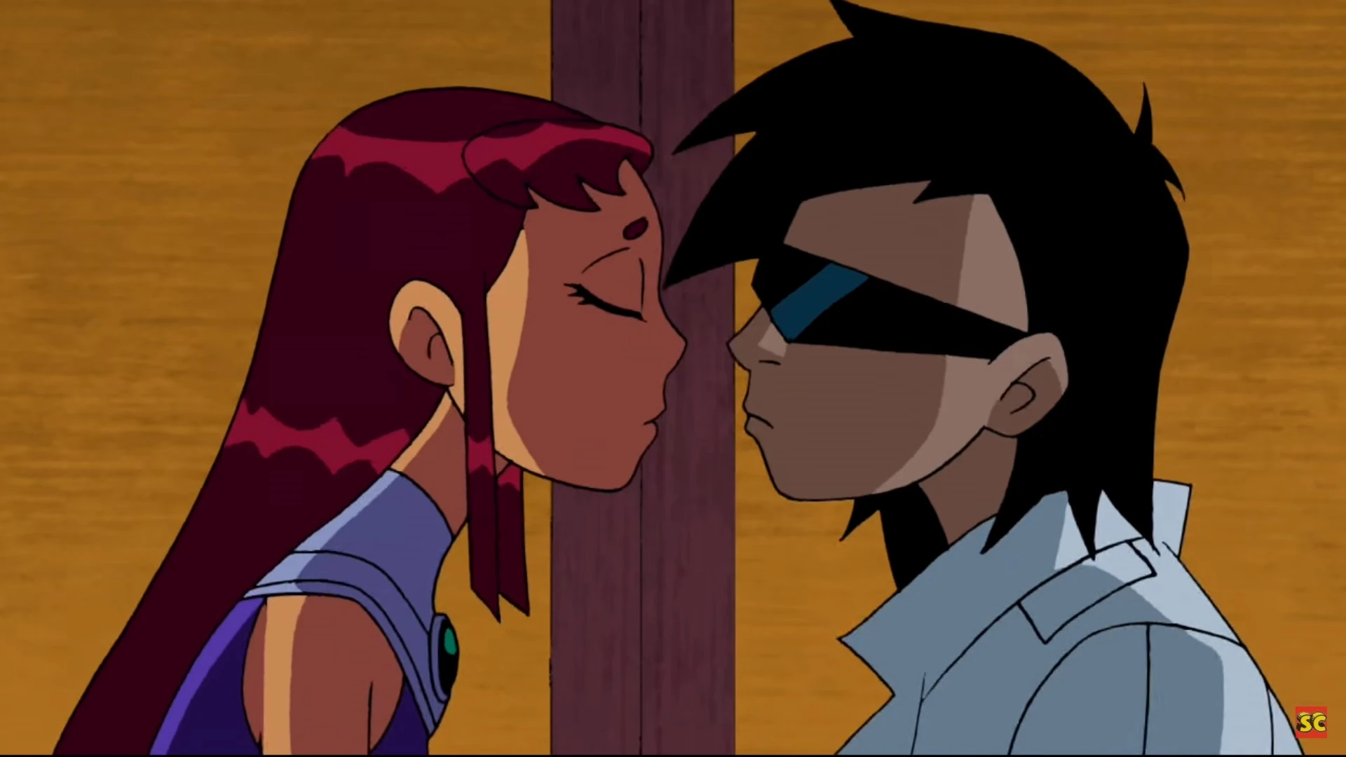 Starfire besa por primera vez a Robin en ¡Adelante! para aprender su idioma.
