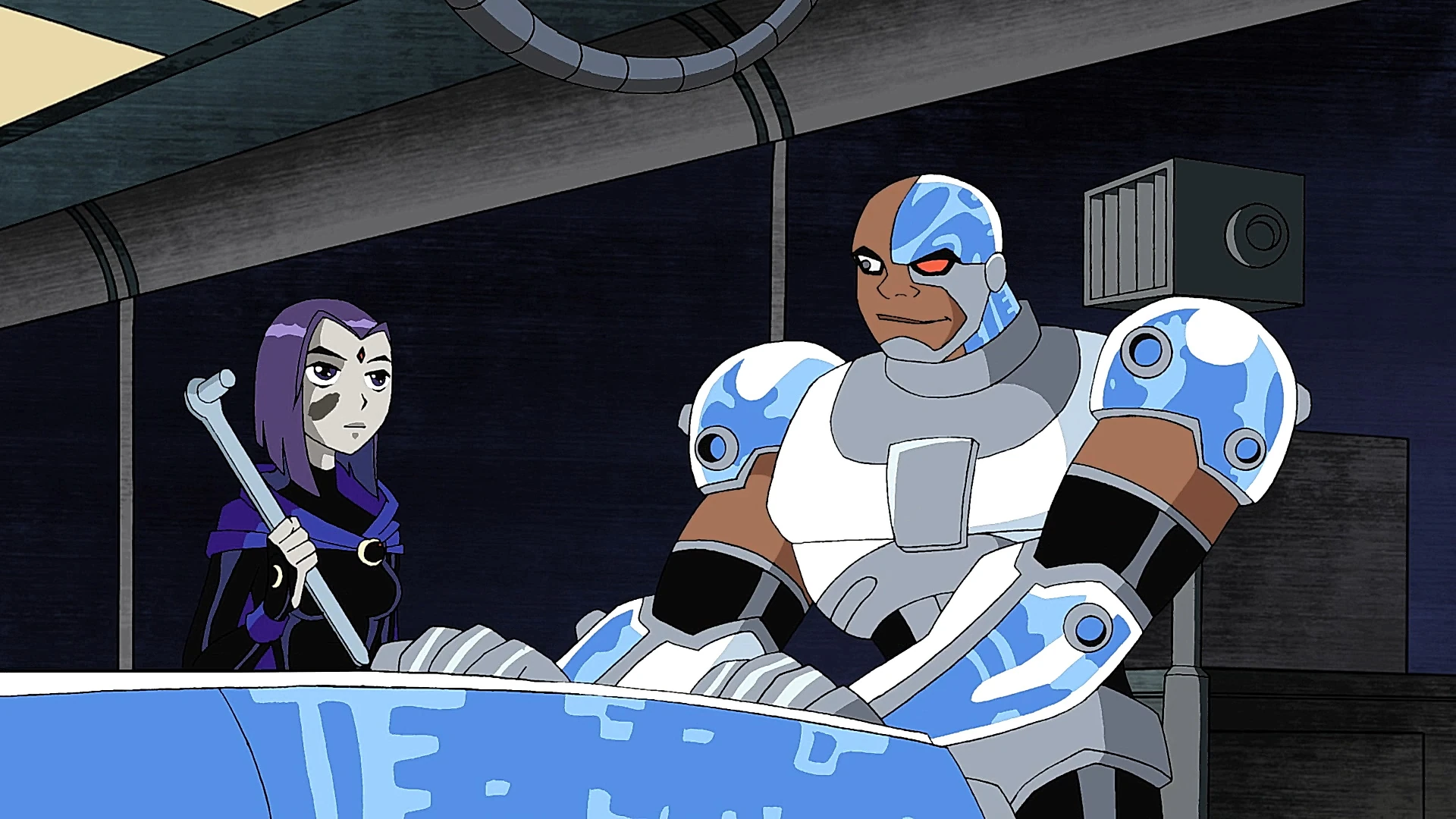 With Cyborg's spirits restored, he gets to work building a brand-new T-Car with Raven's help, and she ends the episode with a bright smile smeared with transmission fluid as soon as it's ready to rock.