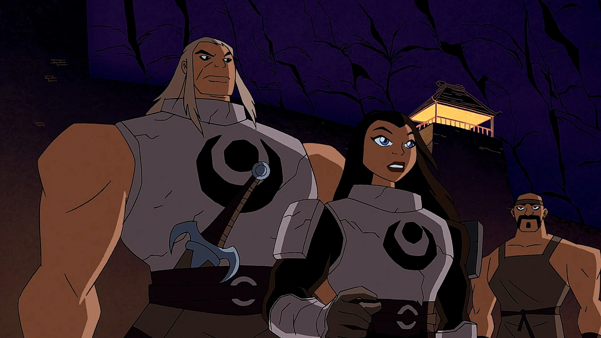 The next day, Cyborg unsuccessfully tries to recharge his batteries with a kit-bashed dynamo when Sarasim visits him. He is mesmerized by how different Sarasim looks without her armor and she explains that she and her people may be warriors, but they are still a proud civilization. This prompts her to ask as to why Cyborg hasn't removed his as well and he simply tells her that his armor really doesn't come off. Sarasim sees this a burden Cyborg must carry; being a warrior every second of every day, which he says is just something to get used to. When she notices Cyborg's kit-bashed dynamo, he explains it's supposed to restore the power he lost from his sonic blasts and she assumes that he needs more food that she'd be happy to provide. However, Cyborg has to elaborate that his situation is dire because he physically can't survive in such a primitive environment. He explains that his efforts against the monsters were simply a gesture of goodwill and that he has his own time and his own battles to seek out. To this end, he decides that the sword is a cultural treasure that belongs with her. Sarasim insists that the sword is his to keep and gives him a tour of her village to soak in her own culture before eventually seeking his own. Upon seeing how prosperous Sarasim and her people are, he comes to care for them as much as she does, declaring that it truly is something worth fighting for. Up on the outer wall, she explains that she used to love the twilight of the setting sun before the invaders first appeared. With the ever-increasing danger of the monster attacks, the sunset only brings fear for their survival. The fear of their inevitable defeat had nearly consumed them for it not have been the arrival of Cyborg. Just before they can share a kiss, a meteorite crashes onto their spot. These meteorites turn out to be more monsters landing square inside the village's perimeter. Outnumbered and surprised, the villagers prepare for battle. Sarasim leads the assault without her armor, informing Cyborg that a true warrior needs no armor. He tries to take them out with more sonics, but cannot fire a single blast since his dwindling power supply must be conserved for his own survival. Fighting them head on fails this time until one warrior throws him a spare sword. Even with an old-fashioned arsenal, Cyborg is outmatched against so many monsters. Outnumbered and outmatched, the villagers prepare to face certain doom. However, Cyborg refuses to accept defeat and sets his sights on the dam which blocks the nearby river. He smashes hard at the support and floods the whole field, dissolving and washing away all the creatures, swiftly defeating them yet again, but losing a considerably substantial layer of armor on his left hand. Once again he is hailed as the village's hero, but he retreats to his dwelling.