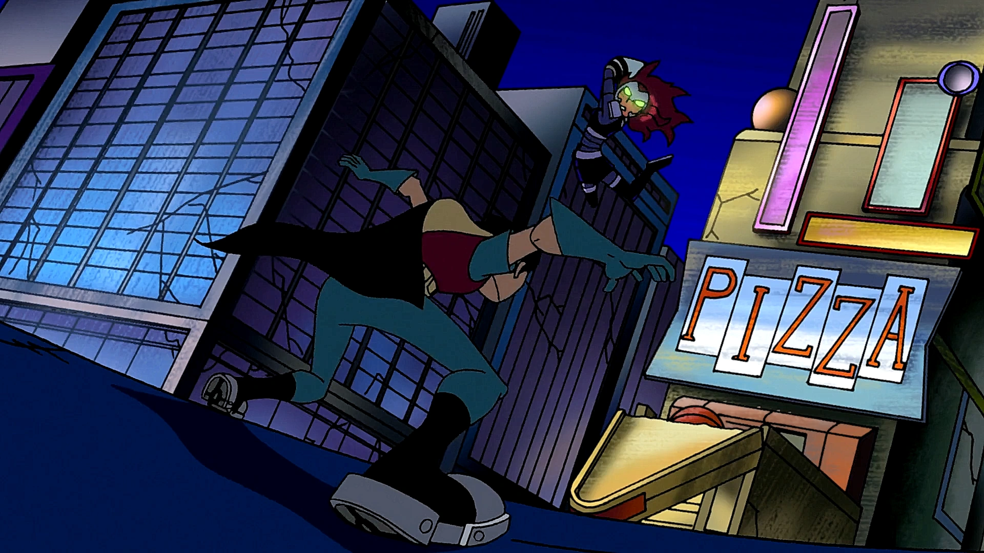 In Jump City in the dead of night, a burglar is escaping federal pursuit with his score through an alleyway. However, he finds his escape short lived as he discovers he is being loomed over by some caped figure. He is then disarmed by a flying bird-shaped glaive. Bats swarm out of the shadows and after them, a caped teenage vigilante known by fearsome reputation. When he appears and takes him out, the burglar recognizes him and wonders what he is doing in Jump City. The young warrior explains that he has recently moved to the City and from now on, works alone. Their fight is interrupted when the warrior sees a flash of green light through the sky that crashes down a few blocks away and goes to investigate after hogtieing the burglar for the police. In the heart of Jump City, the strange alien prisoner has crashed to Earth in the middle of a street and is confused by the alien environment and unable to speak English. She lashes out, wrecking cars and buildings, as she tries to free herself from her manacles. Before she can capsize the upper level of the Pizza Joint with people still on it, the warrior appears and throws another one of his birdarangs to catch her attention. The warrior and the alien engage in an epic battle, but the warrior finds himself a little unprepared for her brute strength. From the shadows, another girl clad in a blue cloak watches the battle. And just when the warrior's retractable bo staff shatters like glass, another warrior with the ability to shapeshift into animals leaps into action send the alien flying. The shapeshifter introduces himself as Beast Boy, an ex-member of the Doom Patrol who offers his assistance, and immediately recognizes the warrior by reputation as the much-loved and admired hero known as Robin. When the alien regains her footing and throws a bus at the two heroes, another figure wearing a sweat suit to conceal his body, shows up as well and catches the bus with his own superhuman strength. Just then, the alien slams her manacles on the ground and shakes the whole city, finally knocking off the first layer of the shackles. With her hands free, she blasts a barrage of green energy bolts at the three heroes, missing but further devastating the city. When she weakens, the heroes take cover behind the bus and the situation appears grim as they seem to have no way of stopping her from destroying the city. Robin refuses to accept defeat on his first night on patrol as his own hero and charges at the alien one last time. However, the cloaked girl appears to them and raises a force field, suggesting that fighting might not be the answer. Robin approaches the alien calmly and carefully and manages to get through to her, calming her enough to free her from the manacles. When everything seems resolved, she then kisses Robin, gaining the ability to speak English, then tells them to leave her alone lest they meet destruction and flies off. With the battle finally over, the four teenage heroes regroup and Beast Boy is prepared to exchange pleasantries.