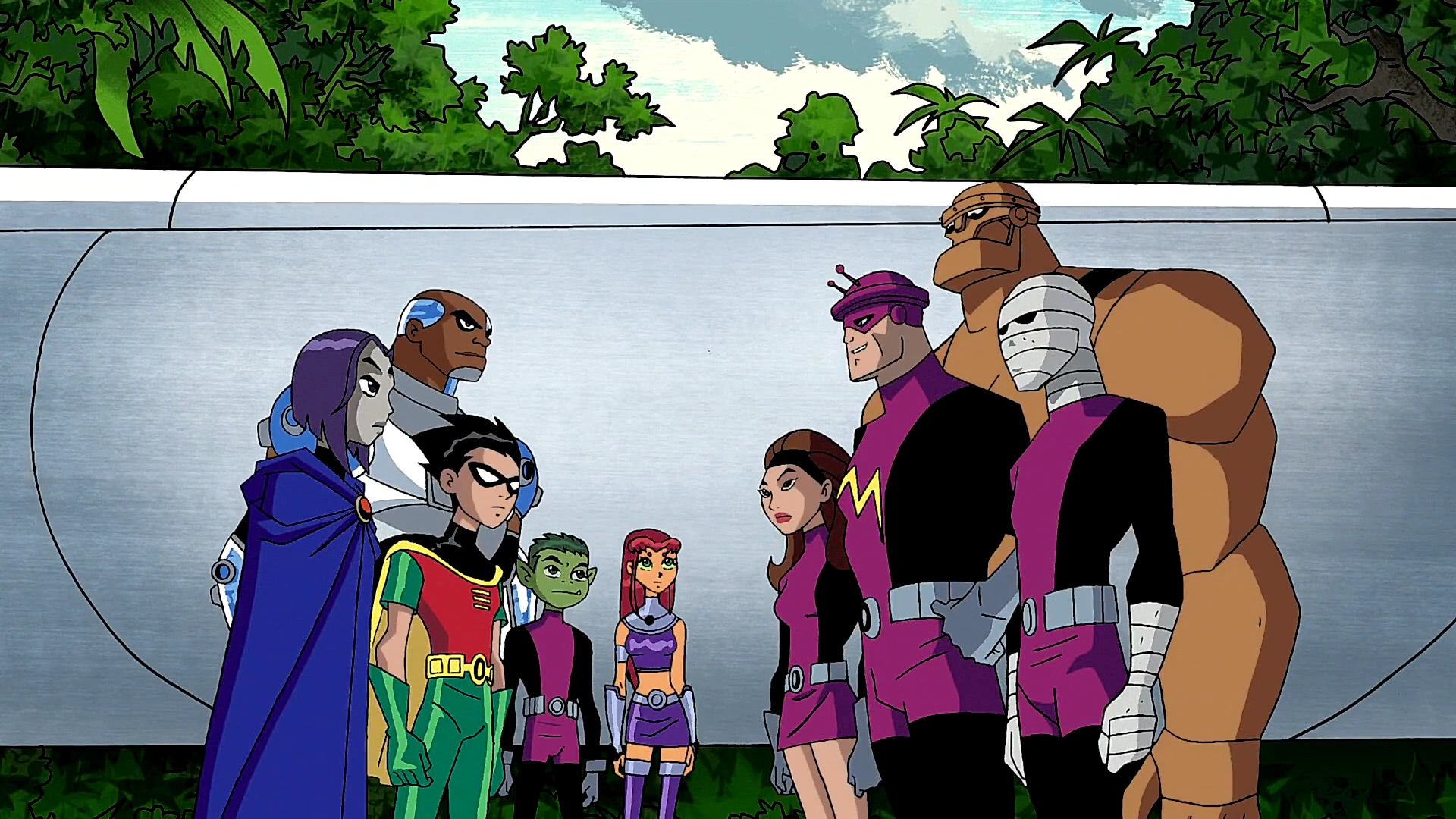 - As Beast Boy stands between the Titans and Doom Patrol in argument, his pants were colored purple instead of black.