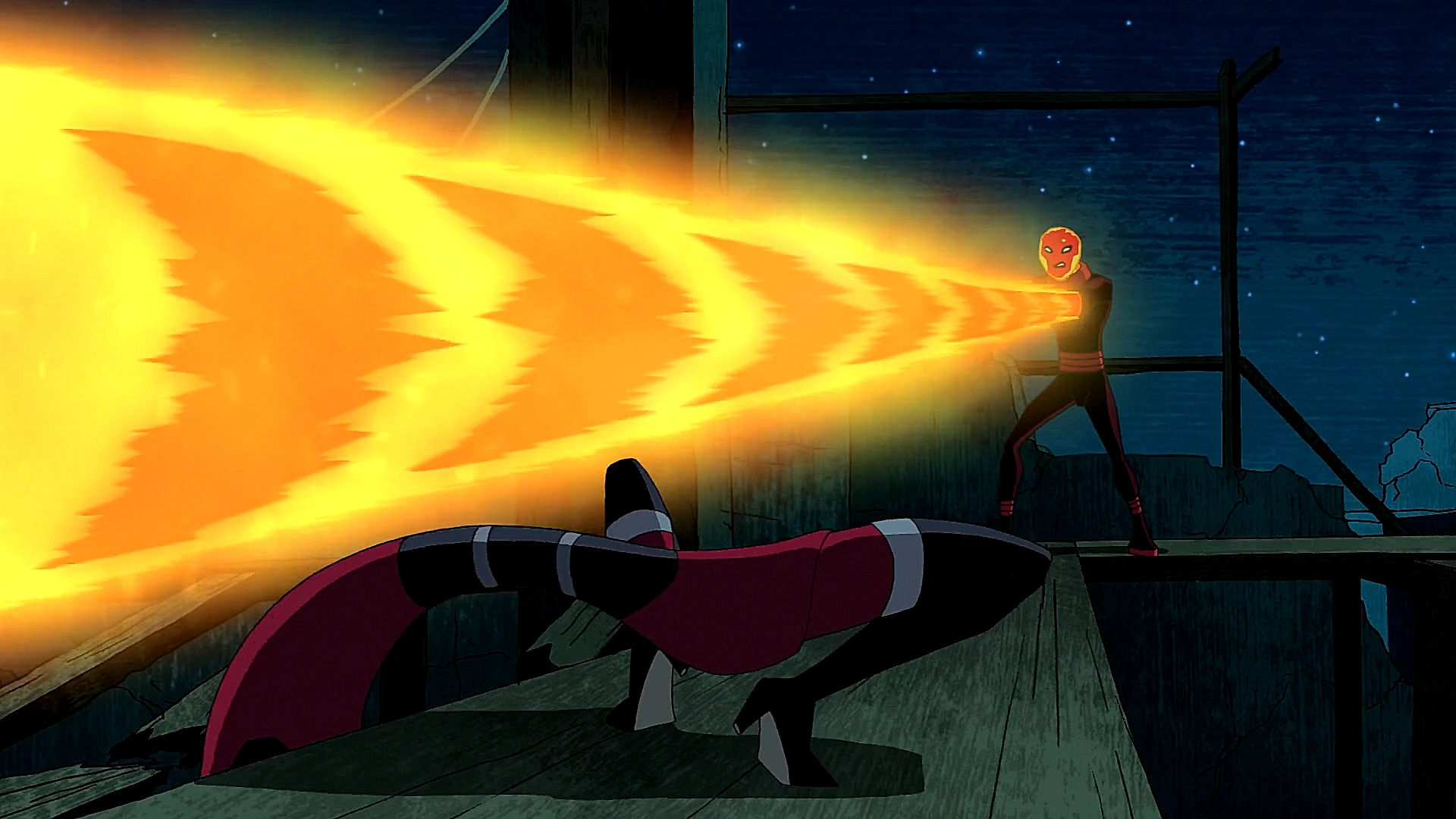 Hot Spot has the ability to convert his body's flesh into an unknown fiery substance. Upon concentration, he can actually generate flames from his hands, which he either hurls offensively (as fire blasts or fire balls) or employs for flying or enhanced jumps by directing a continuous fire burst towards the ground. As seen in the competition of heroes, when Master of Games was using Hot Spot's power, he shot a white laser beam which melted the ground when Robin dodge, so it was presumed it was heat vision. Hot Spot also is quite agile and has fast reflexes. Hot Spot also has some level of superhuman durability and endurance as he has survived being smashed and slammed into buildings with superhuman force and tossed around by Madame Rouge like a rag doll. When irritated or angry, Hot Spot creates a small flame on his head which creates immense heat that shifts the temperature around him while illuminating dark areas. This also allows him to go "Nova"; which causes him to be surrounded by an intense sphere of fire and heat that he can then throw at his enemy, causing a large explosion and demolishing anything hit by it. He can also manipulate heat and make objects hotter, as seen in the episode "Trust" when he shot a fireball at a vase a thief was stealing. Instead of melting the vase, it simply made it too hot for the thief to hold.