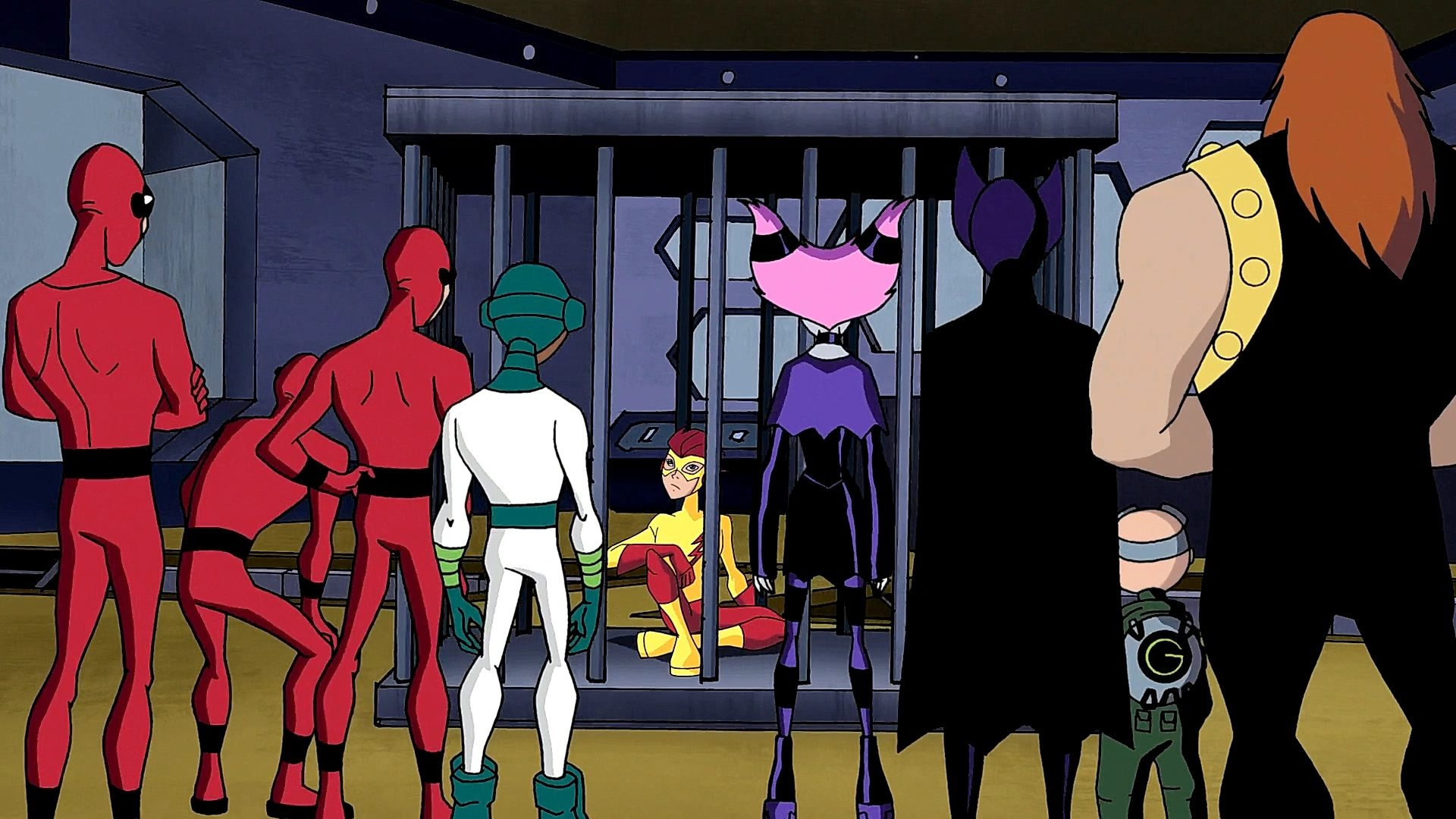 Once he recovers, Kid Flash finds himself in the H.I.V.E.'s headquarters in a cage, with the Five (or rather, Six, as he points out) first standing triumphantly before him before they start bickering about what to do with him. Finally, everyone but Jinx loses interest and leaves much to Jinx's annoyance, and once more Kid Flash tries to convince her that she can do better. Jinx in return holds onto her plan and calls up her idol in the Brotherhood, Madame Rouge, who agrees to come and pick Kid Flash up. But Kid Flash escapes his cage, but before he leaves, he races through the entire H.I.V.E., thoroughly dismantling the facility including Jinx's room (with a little bit of unintentional help from Jinx) much to Jinx's extreme anger, despite the H.I.V.E.'s frantic attempts to stop him.