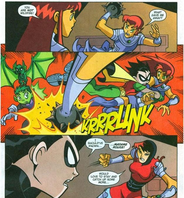 She appeared again in issue #46 Wildfire. Starfire was wondering what had happened to her brother a long time ago, but she saw him come out of a pod that shot towards Earth. After a heartwarming reunion, she introduced him to the other Titans and they had a party at Titans Tower. However, after everybody went to bed, Wildfire started attacking the Titans (Raven and Cyborg). Starfire confronted him, and she discovered that her "brother" was, in fact, Madame Rouge in disguise. It turns out that Blackfire, Starfire's evil sister, had hired Madame Rouge to kill Starfire. Afterward, Blackfire was thrown in jail once again, and Starfire denounces her as a sister and vows to find Wildfire one day.