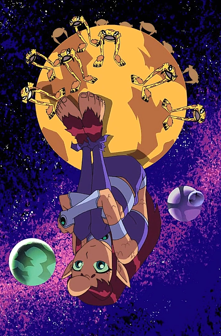 In "Transformation", as Starfire sits on the planet, a group of orange aliens approach her, hinting that she does not have a place on their planet. While searching for Starfire, Robin, Cyborg, Raven, and Beast Boy visit the small orange planet and several orange aliens were on them and the Titans use Beast Boy again by using his neck to tell where Starfire left and one of aliens was using its foot and pointing the direction where Starfire went.