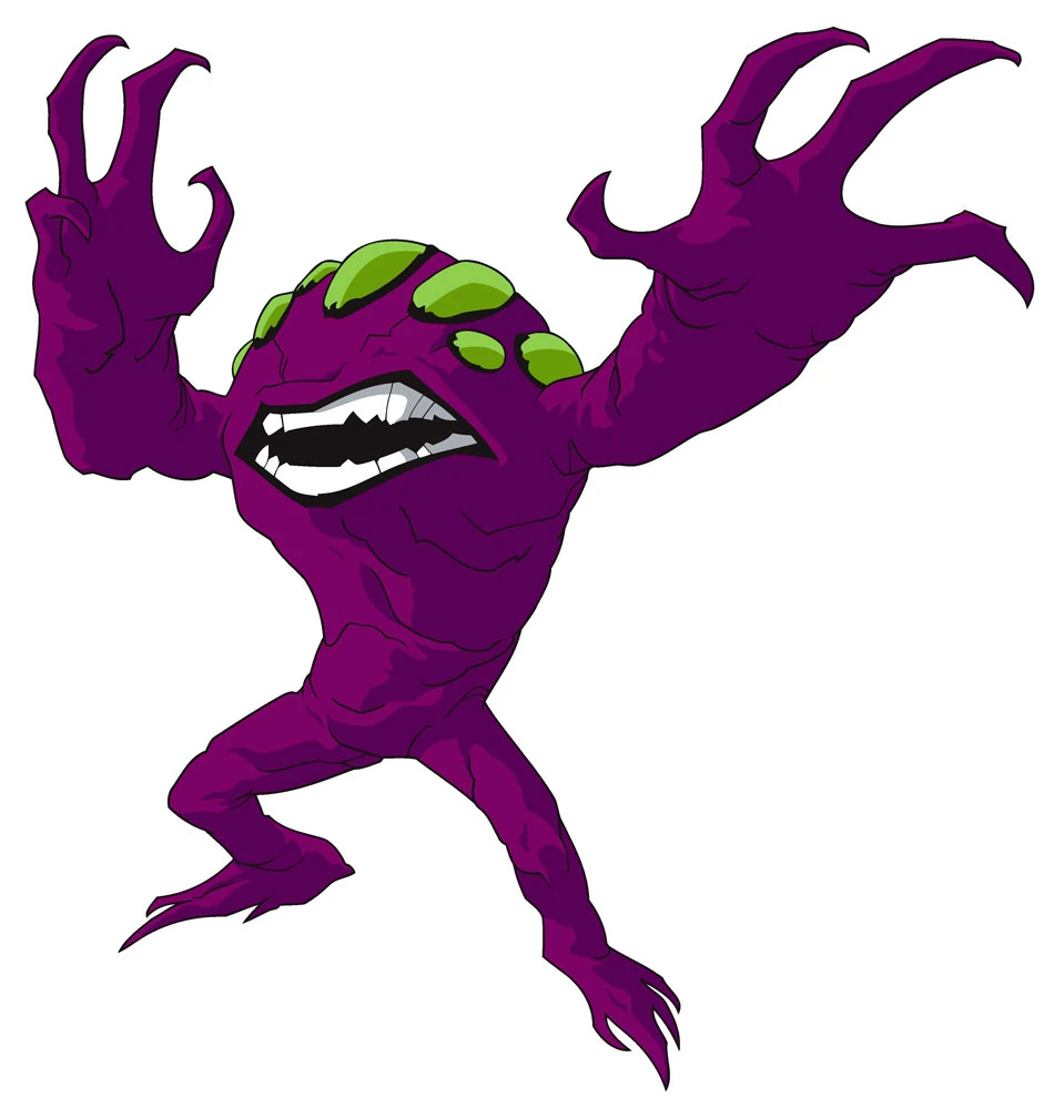 As a whole, Plasmus is a towering repulsive symbiote of dripping dark magenta slime with long, slouching arms, green eyes, and a large mouth. As of "Transformation", Plasmus, after getting exposed to the contents of raw sewage below a football field, gains a newer albeit hideous form: multiple green eyes and boils on his arms along with black lips and his massive teeth are shown.