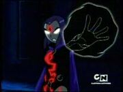 Raven is undeniably the most powerful Titan in the series. As the daughter of a supremely powerful and dangerous inter-dimensional demon, Raven has a host of unique abilities that are tied to her feelings and emotions, and as such, she has trained herself to calm all strong feelings to contain them. Her power is extremely difficult to keep in check, but she has achieved control through daily meditation, mantra[6] and utilizing chakra. She also uses a special mirror, described as "a personal meditation tool used as a portal into the multidimensional world of [her] mind". Total suppression of her emotions, though, can result in her powers subconsciously manifesting - as such, she constantly struggles to express herself while still maintaining control. Raven often uses the incantation "Azarath Metrion Zinthos" as a focal point for her exceptionally strong telekinetic powers. Though Raven has been shown to be rendered powerless when unable to complete this incantation, she has also been shown at certain times being able to access her powers through sheer willpower. Raven's power fluctuates throughout the series; she has been shown gaining incredibly in strength, like when she was tutored by Malchior [7] or when she was empowered by her positive emotions during the battle against Trigon[8], as well as being stripped of her power completely, as when she was regressed to the form of a child following the opening of Trigon's portal.[9] She has also portrayed hidden abilities like stopping time.[10] When Raven's anger gets the best of her, she can transform into her half-demon self, usually with four glowing red eyes (a trait inherited from her demon father, Trigon) and sprouting black tentacles from under her cloak. She has little control over her actions in this state, shown when she was attacking a terrified Doctor Light even after he was begging for mercy.[11] She has also temporarily swapped bodies with Starfire in one episode and swapped powers with Robin in the comics based on the TV series.