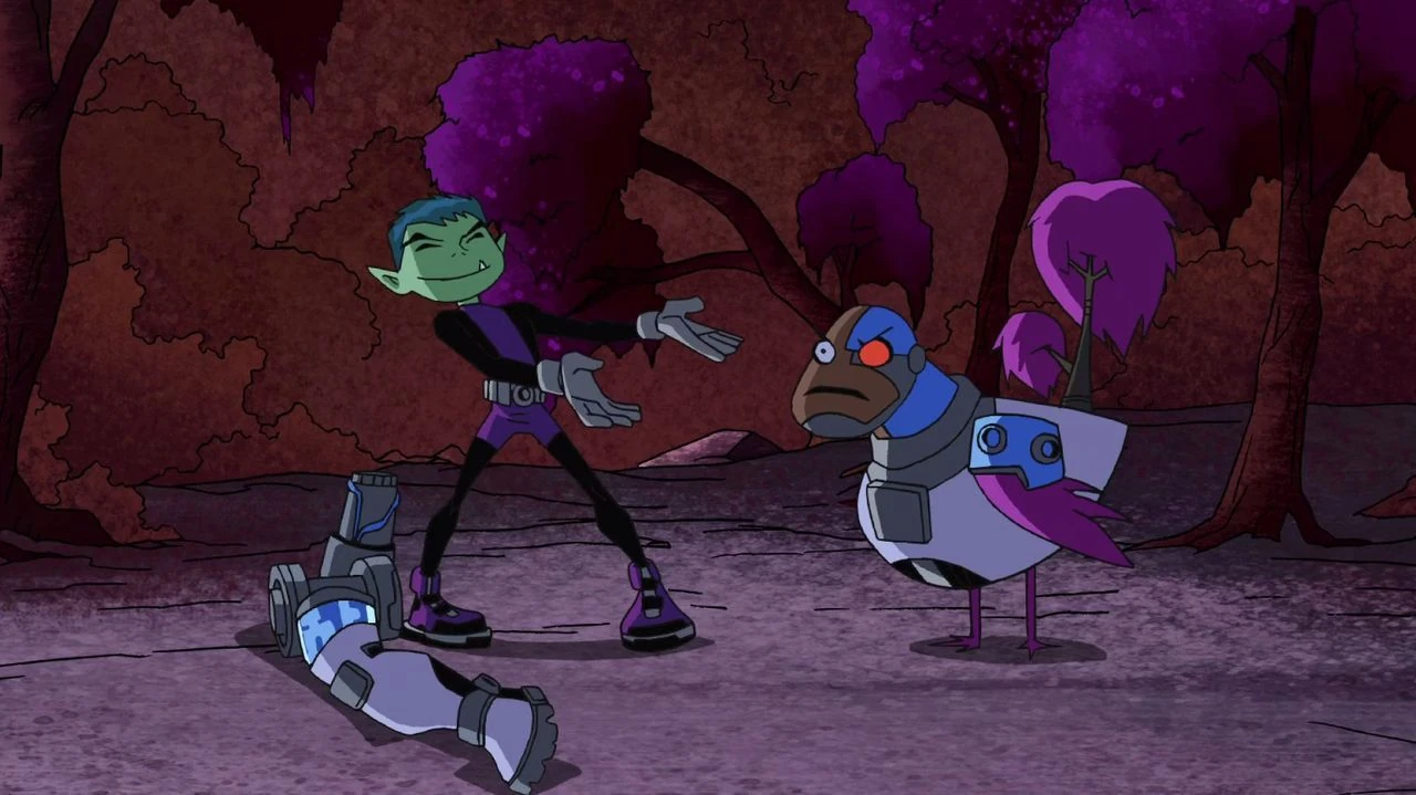 Meanwhile, Beast Boy has managed to find Cyborg and gather up the scattered parts of both Cyborg and the T-Ship, but since Cyborg could not conduct any repairs because he has lost his hands in the crash, Beast Boy has to do the job.