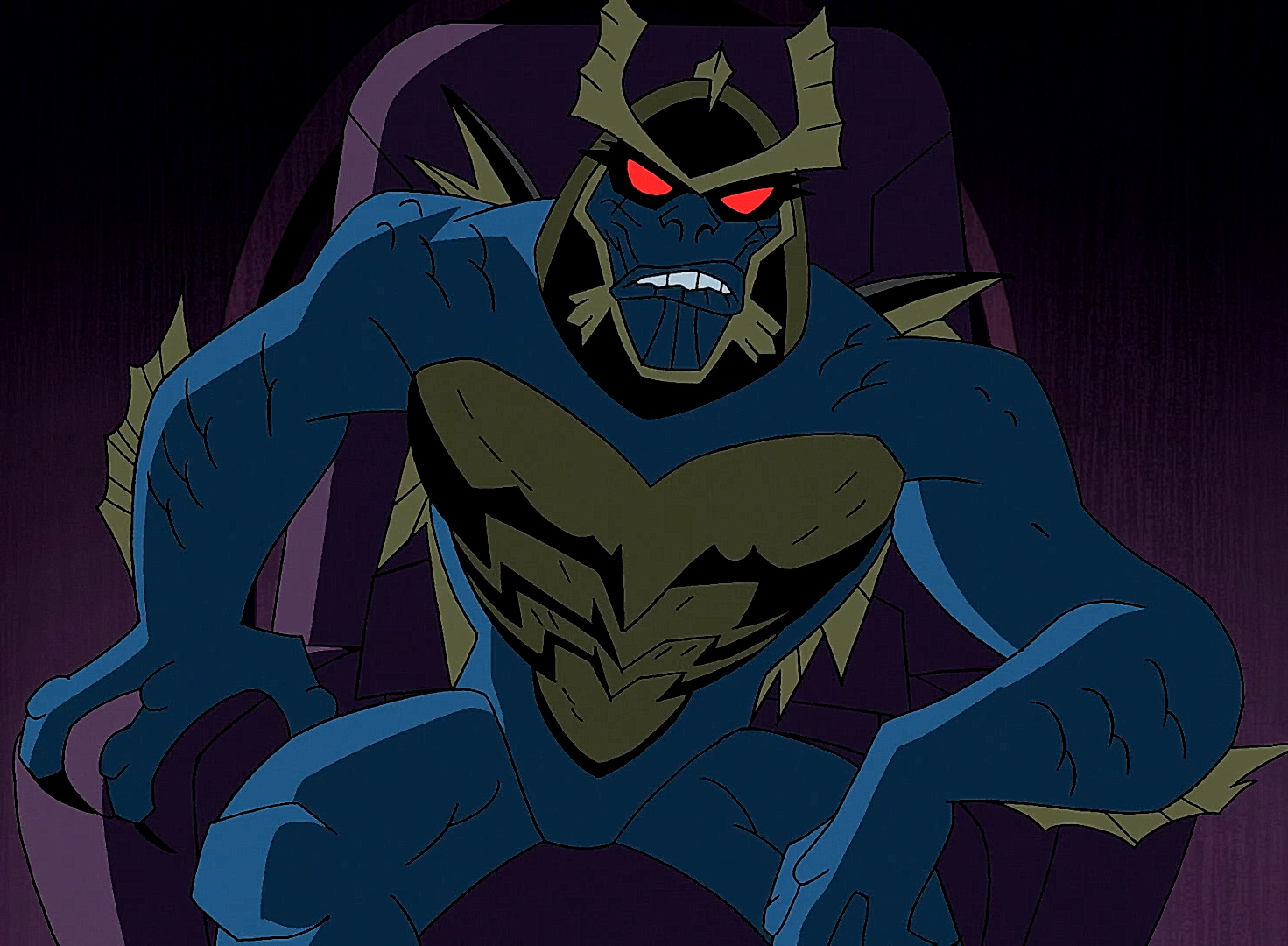 Trogaar has a monstrous, reptilian appearance. His body is muscular and covered in dark blue skin, with sharp claws on his hands and feet. His chest and abdomen are armored with a yellowish-green, plate-like exoskeleton that resembles insect or dragon-like scales. His face is fierce and animalistic, with glowing red eyes and a jagged, crown-like crest on his head. He has large, powerful arms, a long, thick tail, and sharp spikes protruding from parts of his body, enhancing his menacing, beast-like look. Overall, he resembles a hulking, humanoid dragon or lizard-like creature, emphasizing his strength and danger.